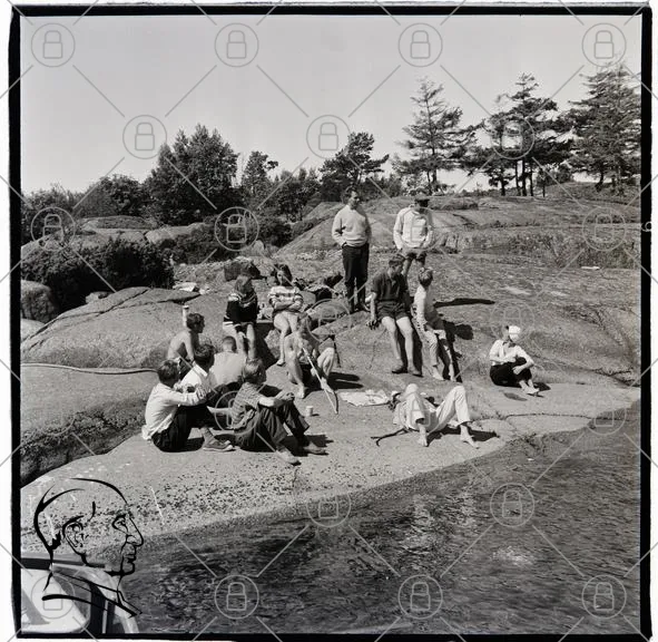 grupp, människor, utomhus, klippor, sommar, träd, vatten, avkoppling, natur, picknick, sol, fritid, landskap, samling, vänner