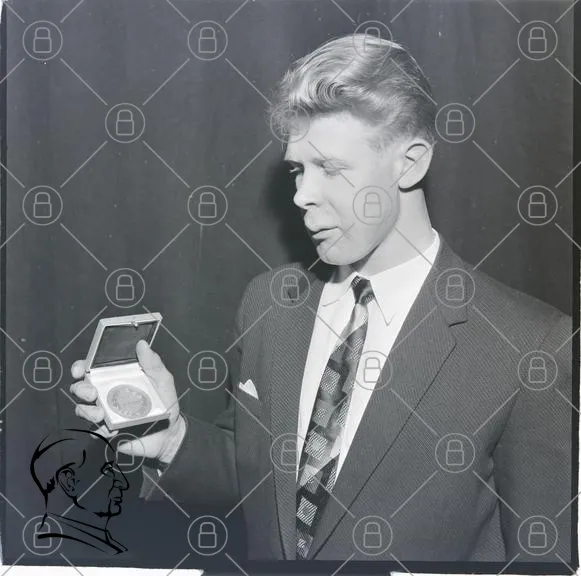 medalj, man, svartvitt, kläder, kostym, frisyr, ansiktsuttryck, hållande, låda, utmärkelse, fotografi, 1950-tal, stil, presentation, bakgrund, ungdom, smycke, prestation, historia, nostalgi
