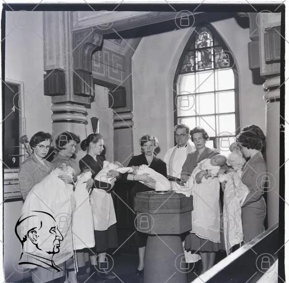 barn, dop, kyrka, kvinnor, män, klänningar, tradition, familj, ceremonin, 1950-tal, barnvagn, fönster, religiös, samling, glädje, gemenskap, historisk, svartvit, kläder, barnkläder, dopklänning, andakt, barnens namn, ritual, högtid, minnen, kärlek, tro, gemensamma värderingar, kultur