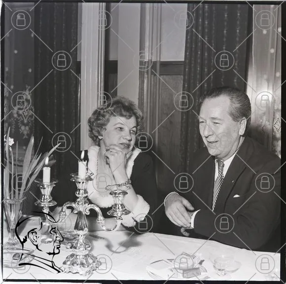 par, middag, bord, ljusstake, blommor, klänning, kostym, 1950-tal, leende, samtal, inomhus, restaurang, dukat bord, elegans, socialt, fest, vintage, svartvitt, interiör, dekoration, ljus, glas, servett, stil, uttryck, ansiktsuttryck, sällskap, atmosfär, tradition, kultur