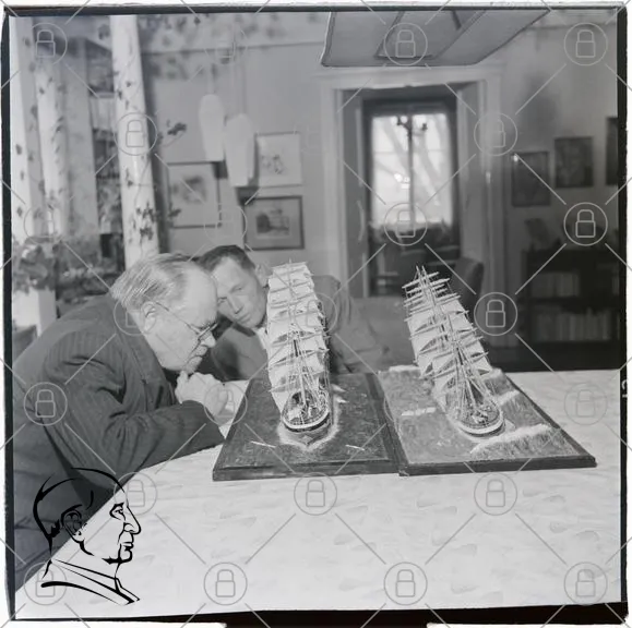 män, modellbåtar, segelbåtar, inomhus, bord, diskussion, 1900-tal, trä, hantverk, detaljer, konst, heminredning, fotografi, svartvitt, nostalgi, vänner, hobby, maritim, sjöfart, skala, handarbete, tradition, kultur, samling, intresse, skapande, design, interiör, konstverk, minnen