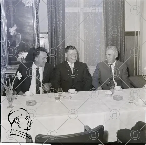möte, män, kostym, bord, samtal, inomhus, 1960-tal, svartvitt, glas, mat, blommor, spegel, stolar, kaffe, diskussion, affärsmän, formell, kläder, interiör, vänskap, skratt, relationer, socialt, tradition, kultur, historia, samarbete, evenemang, representation, nätverk