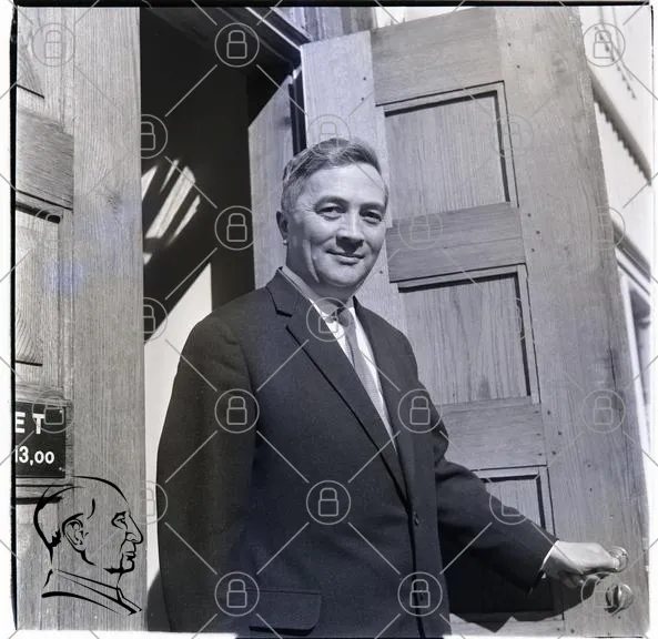 man, dörr, kostym, leende, svartvitt, 1960-tal, porträtt, entré, trä, kontor, formell, affärsmann, kläder, stil, professionell, interiör, utomhus, handtag, byggnad, fotografi