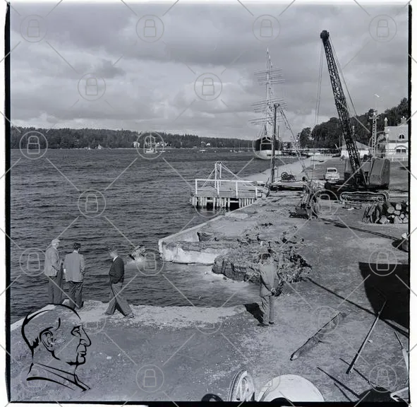 hamn, vatten, kran, byggarbetsplats, män, bilar, träd, himmel, moln, brygga, sjö, landskap, svartvitt, kaj, arbetare, fordon, skog, byggnad, sten, konstruktion