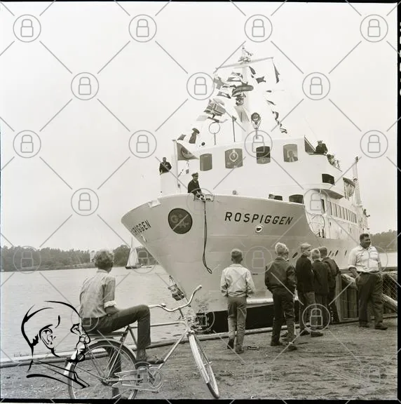 båt, Rospiggen, cykel, barn, vuxna, hamn, vatten, träbrygga, svartvitt, 1960-tal, resande, turism, båttur, sommar, landskap, människor, båtliv, fritid, nöje, fotografering