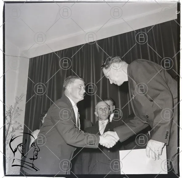 handshake, män, kostymer, scen, gardin, formellt, möte, leende, affärsmöte, grupp, interaktion, ceremoni, svartvitt, fotografering, evenemang