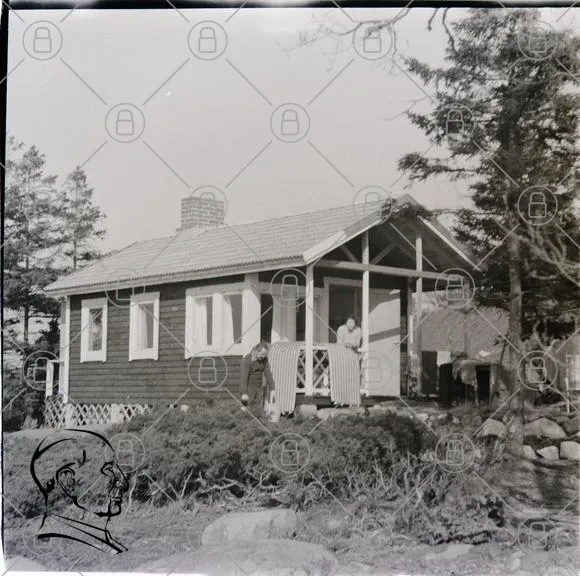 hus, stuga, skog, natur, byggnad, veranda, fönster, tak, murstock, människor, landskap, svartvitt, sommar, utomhus, träd, grönska, sten, traditionell, svensk, hem, avkoppling, semester, lugn, idyll, familj, historia, kultur, arkitektur