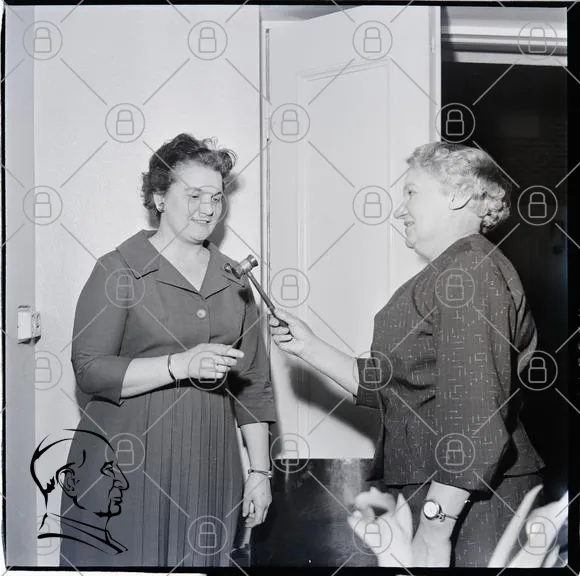 kvinnor, nyckel, ceremon, leende, kläder, 1950-tal, inomhus, dörr, hand, gest, svartvitt, fest, tradition, socialt, samspel, interaktion, glädje, minne, fotografi, vintage, stil, uttryck, gemenskap, kultur, historia, evenemang, festlighet, samling, vänskap, familj, firande