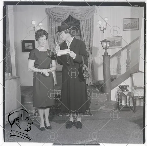 kvinnor, kläder, 1960-tal, inredning, hem, möbler, trappa, fönster, lampor, svartvitt, stil, mode, handväska, broderi, ansiktsuttryck, socialt, interiör, samtal, vintage, retro