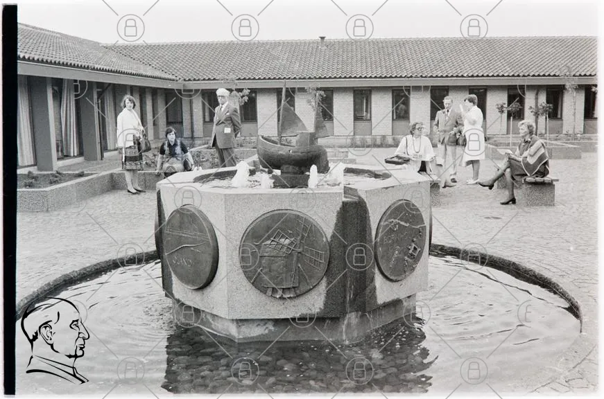 fontän, människor, byggnad, gård, skulptur, 1960-tal, svartvit, kläder, stil, samling, konst, kultur, trä, sten, båt, dekoration, interiör, utomhus, socialt, historiskt, tradition, möte, grupp, landskap, design, arkitektur, torg, monument, detaljer, fotografering