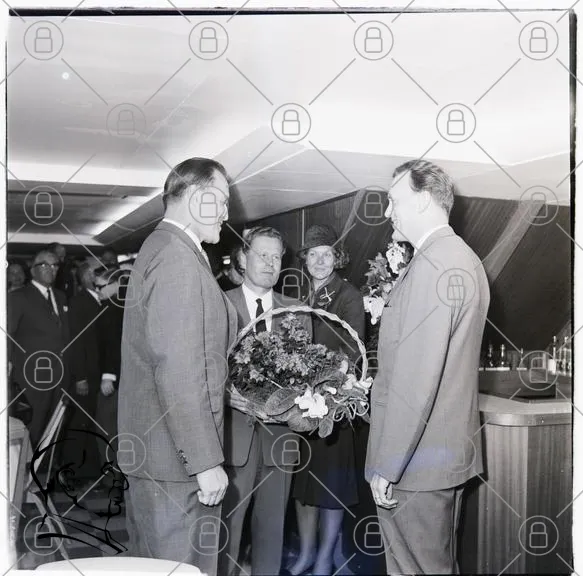 blommor, presentation, män, kvinnor, fest, kläder, 1960-tal, inomhus, samling, möte, basket, korg, dekoration, leenden, formell, evenemang, bakgrund, bord, bar, stolar