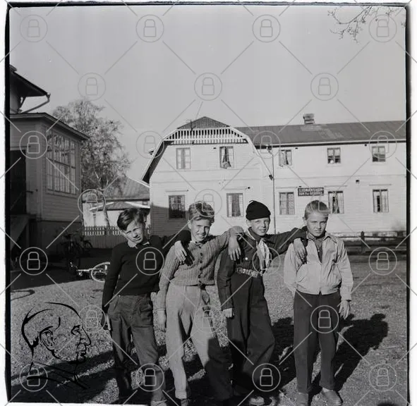 pojkar, grupp, utomhus, byggnad, gård, svartvitt, kläder, vänskap, soligt, skugga, träd, cykel, fönster, tak, hus, grus, byxor, tröjor, mössa, leende, armar om varandra, gammaldags, 1900-tal