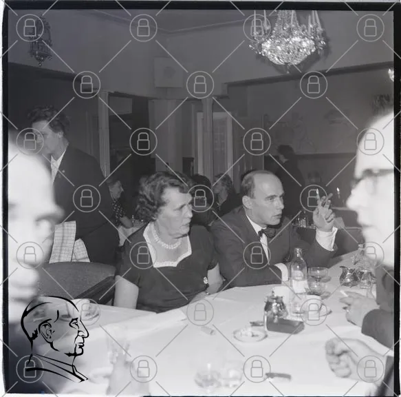 middag, fest, människor, kläder, bord, glas, mat, samtal, belysning, inredning, 1950-tal, socialt, sällskap, eleganta, dekorationer, drycker, leenden, interaktion, stämning, svartvitt
