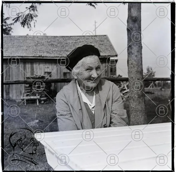 kvinna, äldre, leende, svartvit, utomhus, träd, stuga, träbord, basker, landsbygd, sommar, porträtt, traditionell, skog, staket
