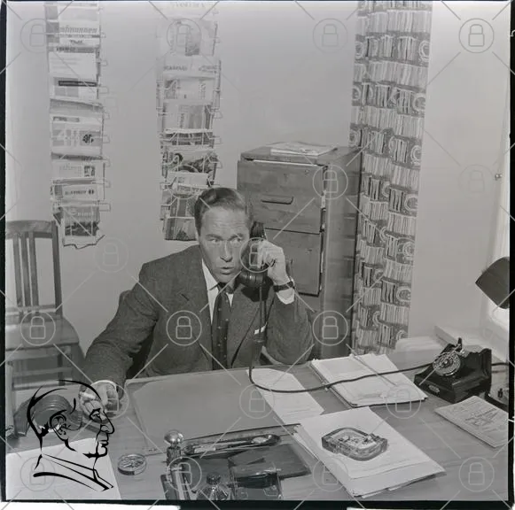 man, telefon, kontor, skrivbord, dokument, stolar, väggar, tidningar, 1950-tal, svartvitt, affärsmann, anteckningar, skrivmaskin, telefonlur, kontorsmiljö, trä, papper, kontorsutrustning, fönster, belysning, formell klädsel, professionell, kommunikation, arbetsplats, kontorsinredning, vintage, retro, affär, samtal, fokus