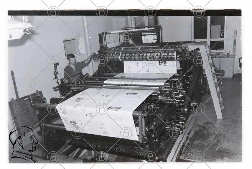 tryckpress, tryckning, svartvitt, industri, papper, tryckeriar, maskin, arbete, 1900-tal, fotografi, tryckare, produktion, teknik, historisk, press, tryckmaterial, kontor, tryckprocess, mekanik, hantverk, arbetsmiljö, tryckfärger, tryckresultat, bild, tryckmaskin, tryckeri, arbetsplats, man, tryckta sidor, tryckta medier