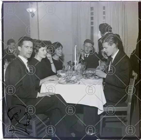 middag, fest, klädd, elegant, bord, mat, dryck, ljus, sällskap, 1950-tal, svartvitt, restaurang, samtal, servett, glas, tallrik, stolar, dekoration, socialt, samvaro