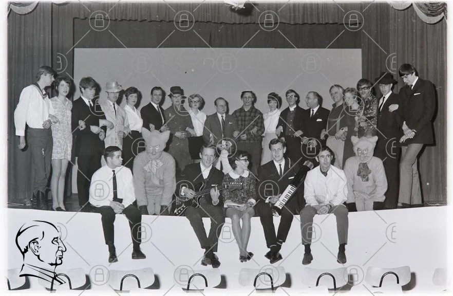 svartvitt, gruppfoto, 1960-tal, kläder, kostymer, clown, musik, gitarr, piano, scen, underhållning, leenden, fest, människor, retro, vintage, teater, föreställning, samling, skratt, kultur, evenemang, socialt, gemenskap, artistisk, minnen, nostalgisk, humor, tradition, familj