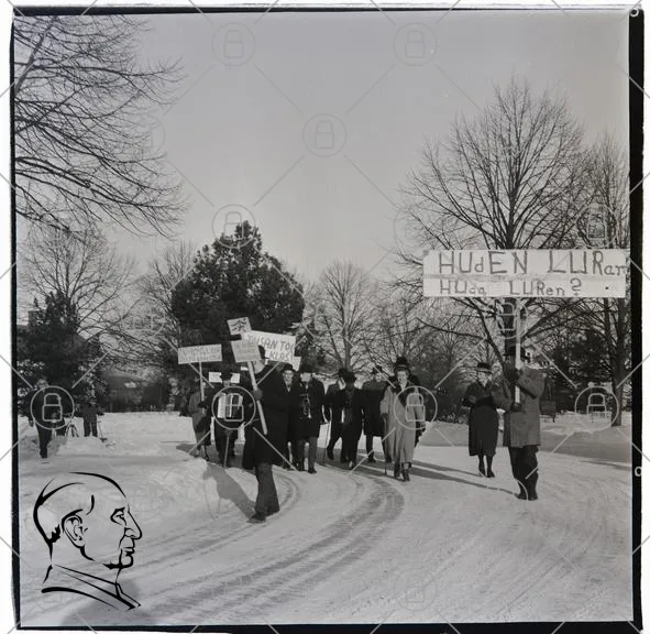 demonstration, skyltar, vinter, snö, människor, protest, träd, park, vinterkläder, text, Huden Lurad, utomhus, grupp, kallt, vinterlandskap