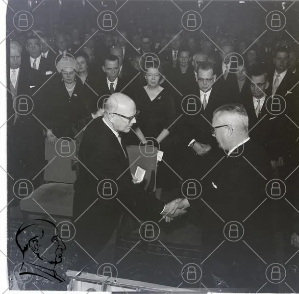 ceremoni, handskakning, talare, publik, kostymer, svartvitt, formellt, evenemang, dignitärer, sittande, klänningar, män, kvinnor, 1900-tal, historia, diplomati, samling, högtidligt, åhörare, podium, ledare, tradition, minnesvärd, samarbete, kultur, samhälle, respekt, artighet, formalitet, presentation, evenemangsplats