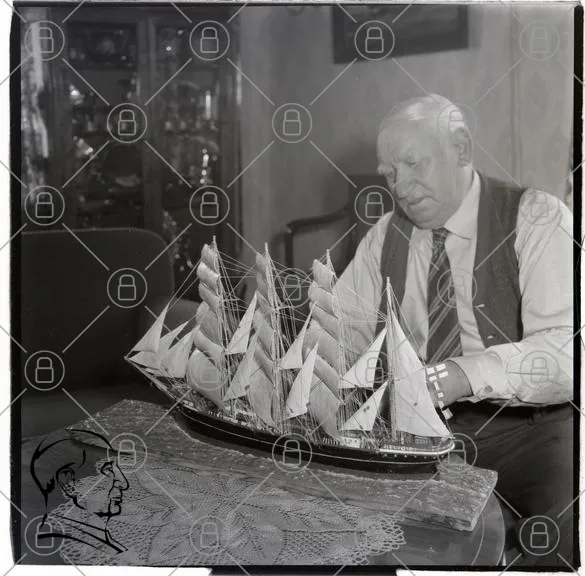 båt, modell, segelbåt, man, bord, inomhus, vintage, handarbete, detaljer, duk, möbler, gammal, hobby, trä, segel, marin, nostalgi, konst, hantverk, tradition, heminredning, fotografi, svartvit, 1900-tal, sjöfart, passion, samling, historia, kultur