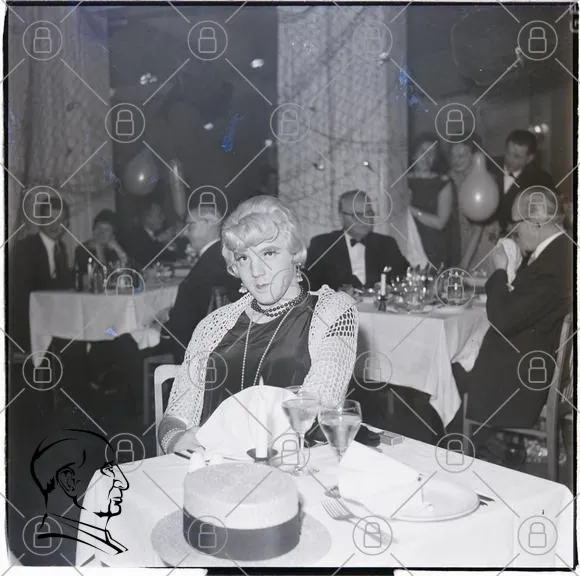 fest, middag, tårta, glas, klänning, 1960-tal, svartvitt, dekorationer, människor, bord, servetter, ballonger, leenden, eleganta kläder, festligheter, restaurang, sällskap, mat, dryck, kvinnlig, manlig, socialt, firande, stil, retro, fotografi, minnen, feststämning, bordsdukning, festkläder