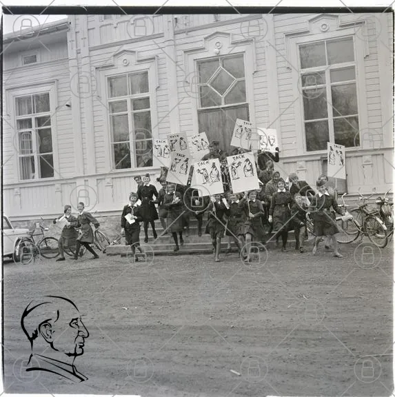 barn, demonstration, skyltar, cyklar, skola, svartvitt, utomhus, grupp, protest, 1900-tal, kläder, lek, glädje, samhälle, historisk, ungdom, aktivitet, fotografering, byggnad, tradition, gemenskap, engagemang, skolbarn, konst, medvetenhet, kultur, historia, lekfullhet, uttryck, kreativitet