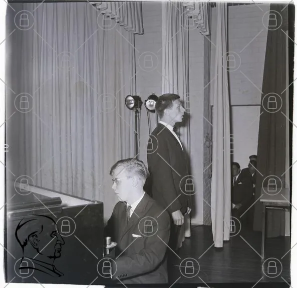 piano, man, stående, sjunga, scen, kläder, kostym, mikrofon, belysning, publik, svartvitt, 1950-tal, musik, framträdande, artist, föreställning, tyg, gardiner, koncentration, prestation