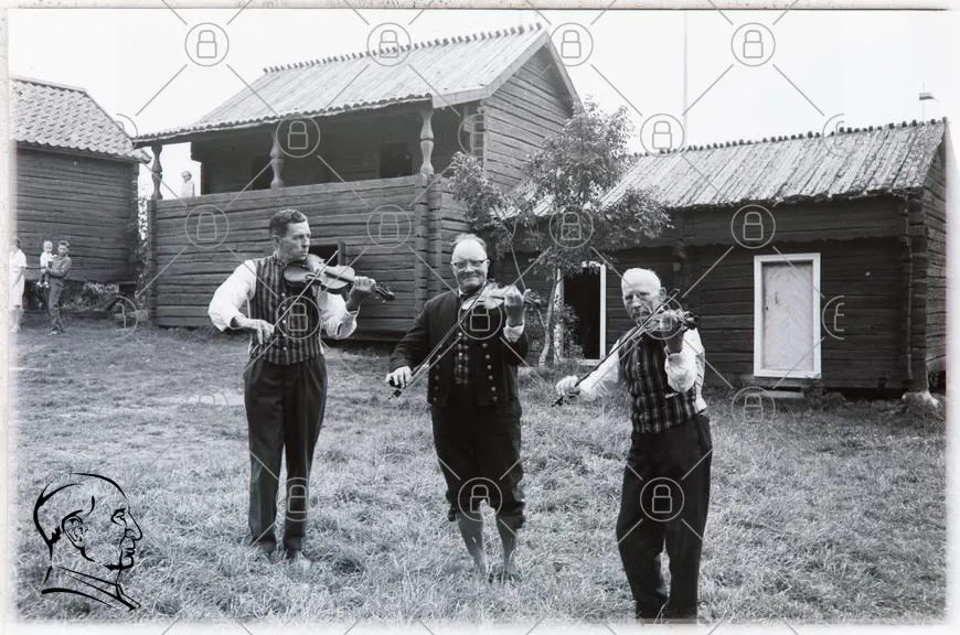 fiol, musiker, traditionell, kläder, svartvitt, utomhus, byggnad, träd, gräs, man, spelande, folkmusik, kultur, gammal, landsbygd, instrument, samspel, trio, folklig, historia, hantverk, fest, glädje, samvaro, musik, konst, svensk, äldre, män, folkloristisk