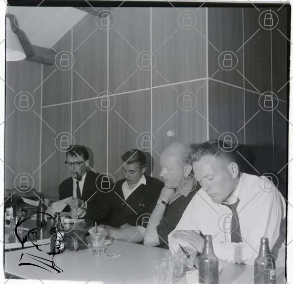 möte, män, bord, dryck, glas, flaskor, diskussion, svartvitt, inomhus, kläder, 1960-tal, allvarliga, samtal, träväggar, belysning, ansiktsuttryck, grupp, professionell, kontorsmiljö, socialt, samarbete, traditionell, stil, interiör, fokus, uttryck, samling, affärsmän, observation, analys