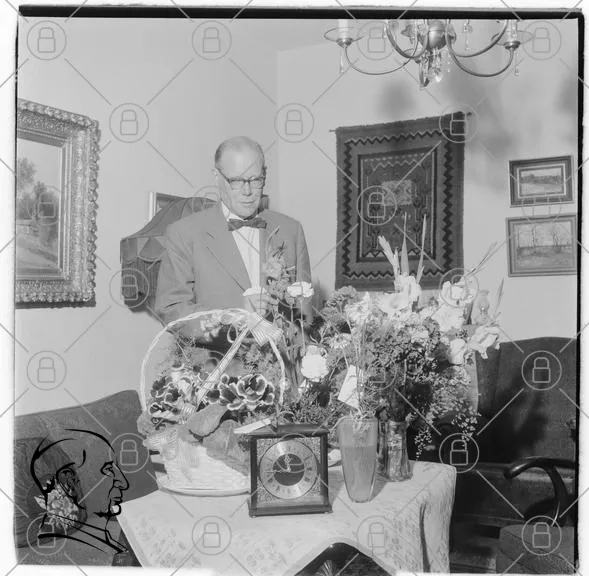man, kostym, fluga, blommor, blomsterarrangemang, bord, klocka, tavla, inredning, lampa, soffa, duk, svartvitt, vintage, hem, dekoration, konst, fotografi, tradition, fest, stil, elegans, gammaldags, interiör, familj, samling, minnen, nostalgi, kultur