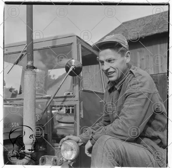 traktor, man, leende, jordbruk, landskap, gammal, maskin, Ferguson, arbetskläder, hatt, 1900-tal, svartvit, utomhus, verkstad, rural, traditionell, teknik, jordbrukare, historia, nostalgi
