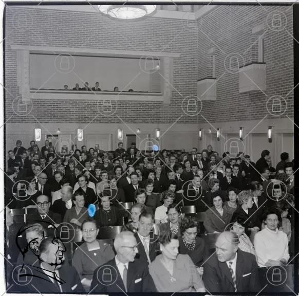 publik, möte, konferens, människor, kläder, 1950-tal, inomhus, sittande, samling, evenemang, auditorium, svartvitt, ansikten, bänkar, väggar, belysning, kvinnor, män, åhörare, gemenskap, tradition, formalitet, samarbete, diskussion, uppmärksamhet, kultur, historia, socialt, arrangemang, presentation