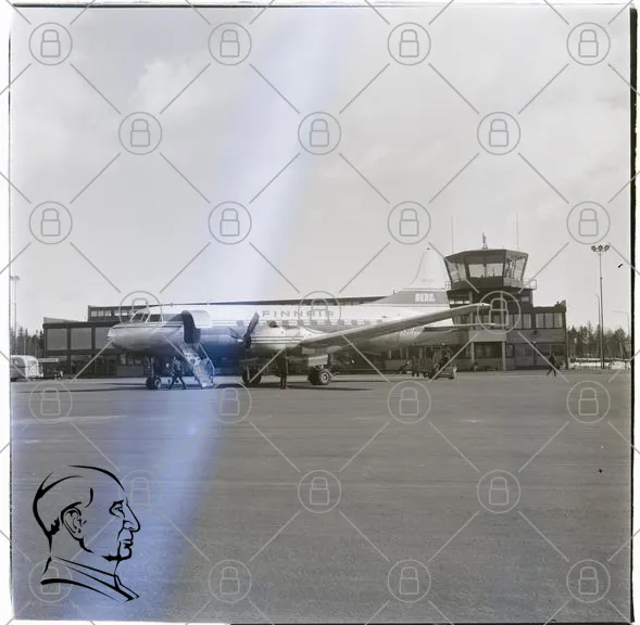 flygplan, Finnair, flygplats, terminal, landning, parkering, 1950-tal, svartvit, luftfart, resor, passagerare, kontrolltorn, markpersonal, flygplanssteg, asfalt, himmel, moln, retro, transport, flygning