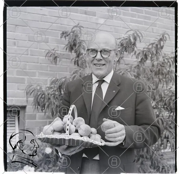 man, korg, frukter, potatisar, svartvitt, glasögon, kostym, trädgård, växtlighet, leende, 1960-tal, retro, traditionell, mat, skörda, utomhus, porträtt, gammal, hand, natur, bakgrund, vägg, bricka, jordbruk, familj, hem, livsstil, kultur