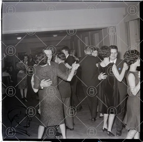 dans, fest, 1960-tal, klänningar, kostymer, par, socialt, musik, dansgolv, retro, svartvitt, eleganta, glädje, samvaro, dansa, festlokal, stil, minnen, ungdomar, vuxna, danspartner, danssteg, feststämning, nostalgisk, kultur, evenemang, sällskap, tradition, dansa tillsammans