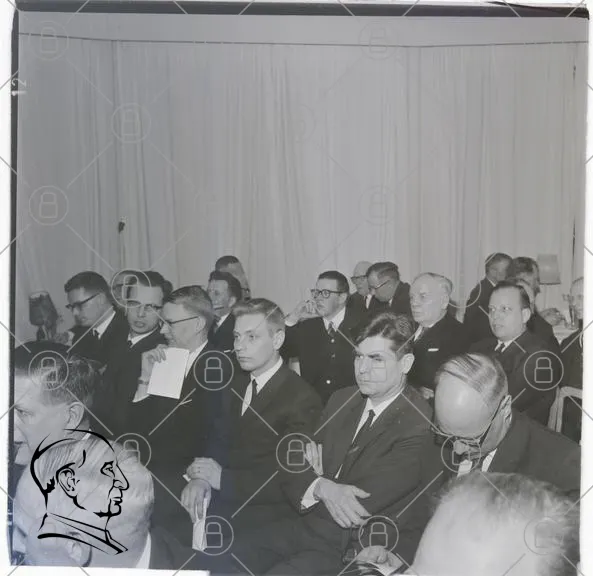 möte, män, kostymer, slipsar, publik, inomhus, svartvitt, 1960-tal, formell, samling, diskussion, åhörare, kläder, ansikten, sittande, evenemang, konferens, traditionell, allvarlig, presentation, belysning, bakgrund, väggar, stolar, dokument, anteckningar, professionell, stil, grupp, samhälle