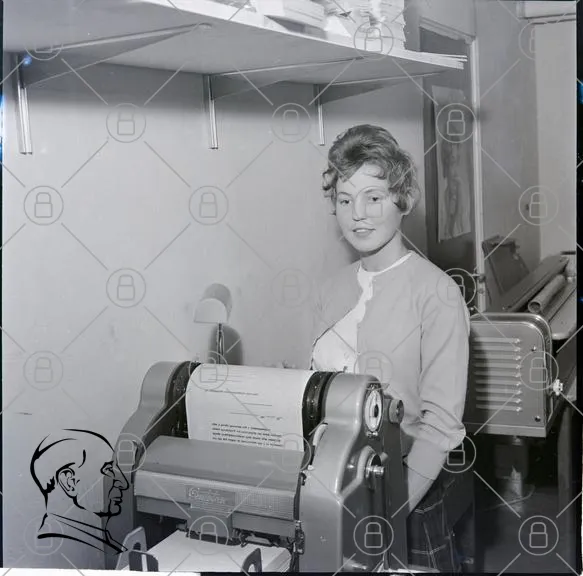 typograf, kvinna, skrivmaskin, kontor, svartvitt, retro, 1960-tal, arbete, papper, lampa, inredning, porträtt, vintage, teknik, kontorsutrustning, dokument, stil, kreativitet, professionell, arbetsmiljö
