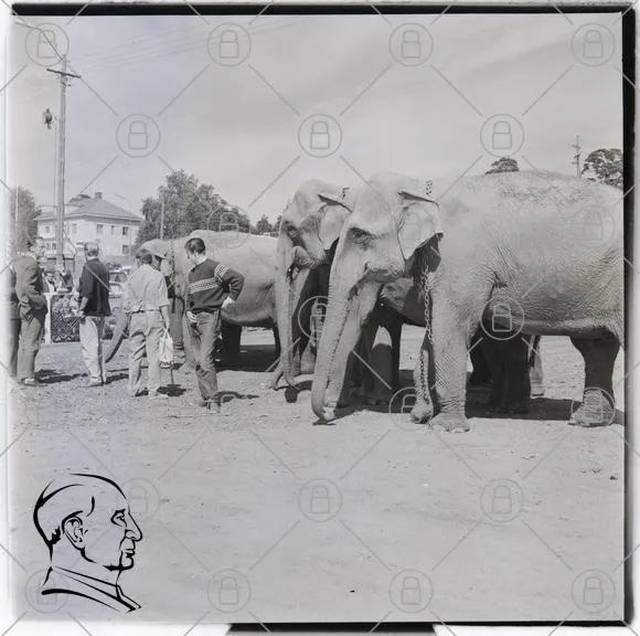 elefanter, människor, cirkus, djur, utställning, 1900-tal, gator, publik, träd, byggnader, vintage, svartvitt, samling, evenemang, natur, underhållning, djurpark, fotografering, tradition, folkliv, landskap, historia, socialt, kultur, nöje, djurhållning, turist, resande, samhälle, interaktion