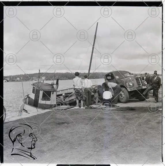 båt, lastbil, hamn, människor, vatten, brygga, segel, arbete, 1900-tal, svartvit, fiske, transport, landskap, aktivitet, utrustning, lastning, strand, båtliv, fordon, sjöfart