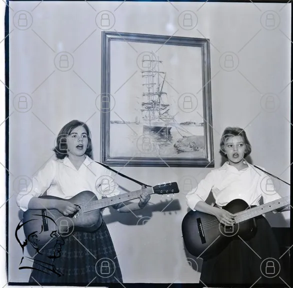 sjungande, tjejer, gitarrer, svartvitt, konst, tavla, segelbåt, kläder, 1960-tal, musik, ungdomar, inomhus, porträtt, kultur, tradition, sång, prestation, leenden, vintage, fotografi, scen, underhållning, grupp, hobby, instrument, uttryck, glädje, samarbete, kreativitet, nostalgi