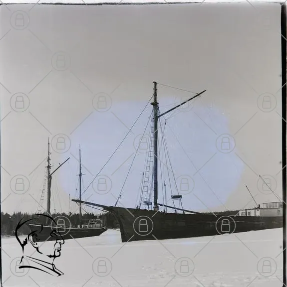 skepp, båtar, segelbåtar, vinter, is, hamn, mast, rigg, trä, svartvitt, landskap, sjö, natur, stillhet, historia, transport, marin, segling, tradition, kultur, fotokonst