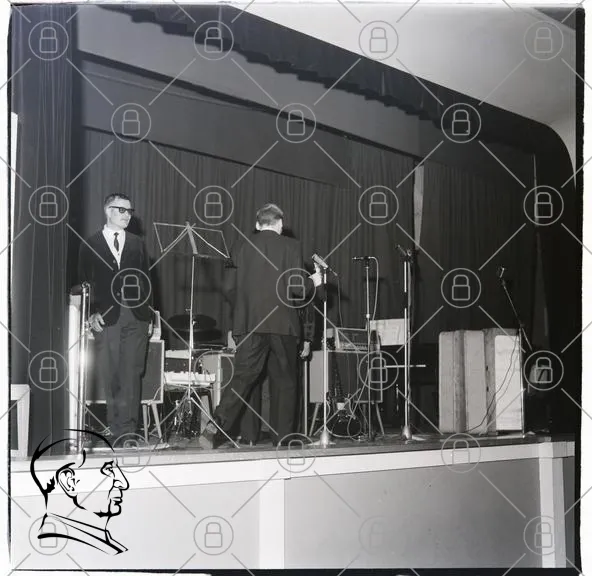 scen, män, kostymer, glasögon, mikrofoner, musik, uppträdande, publik, svartvitt, 1960-tal, instrument, kläder, föreställning, stående, bakgrund, belysning, podium, evenemang, artister, traditionell, kultur, teater, ljudutrustning, repetitioner, presentation, stil, formal, samling, arrangemang