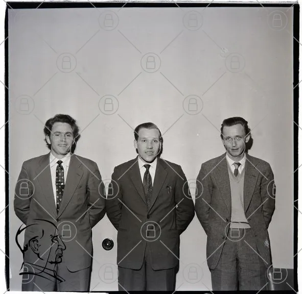 tre män, kostymer, slipsar, svartvitt foto, gruppfoto, formell klädsel, porträtt, leende, kavajer, skjortor, 1950-tal, retro, klassiskt, mänskliga figurer, stående, interiör, vägg, formellt, mode, vintage