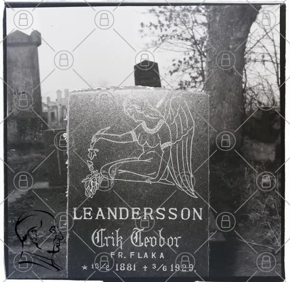 gravsten, kyrkogård, ängel, Leandersson, Erik Teodor, Fr. Flaka, 1881, 1929, svartvitt, sten, minnesmärke, grav, inskription, blommor, konstverk, dödsdatum, födelsedatum, träd, bakgrund, historisk, gammal, sorg, minne, dekoration, skulptur, relief, konstnärlig, symbolik, natur