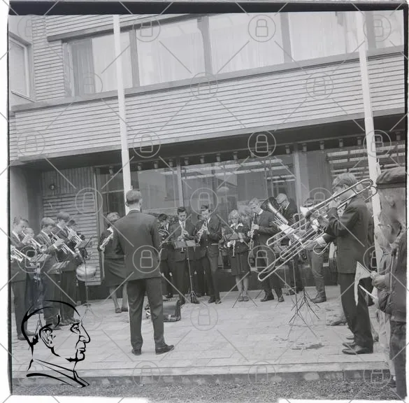 musiker, orkester, brassband, konsert, utomhus, dirigent, instrument, trummor, tromboner, trumpeter, kläder, samling, uppträdande, flaggor, byggnad, publik, svartvitt, tradition, musik, fest, kultur, gemenskap, ljud, rytm, prestation, glädje, samarbete, evenemang, scen
