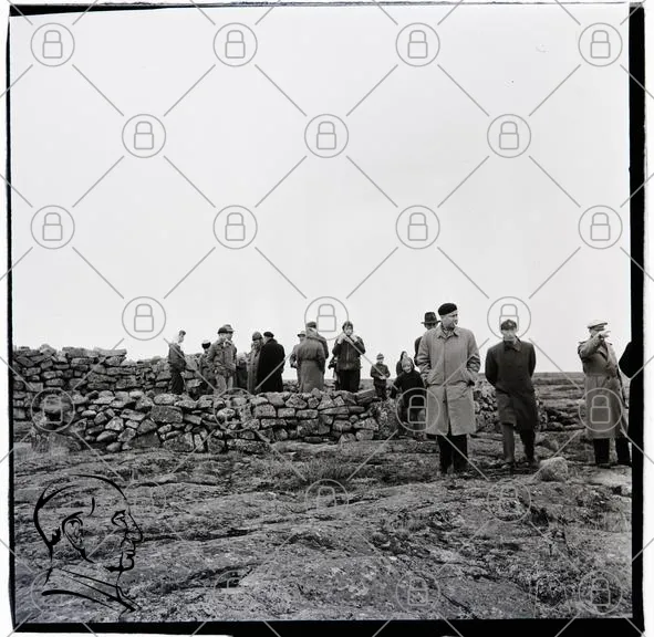 människor, stenmur, utomhus, landskap, kappa, hatt, grupp, svartvitt, historisk, fält, gräs, himmel, fotografering, samling, kläder, natur, sten, observation, möte, gammaldags