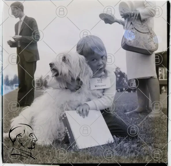 hund, barn, vit, gräsmatta, tävling, nummerlapp, svartvitt, sällskapsdjur, leende, kläder, vuxen, bakgrund, fotografi, lek, vänskap, djur, utställning, barn och hund, 1960-tal, nostalgi, familj, glädje, natur, park, socialt, evenemang, sällskap, barnkläder, hundras, hundutställning