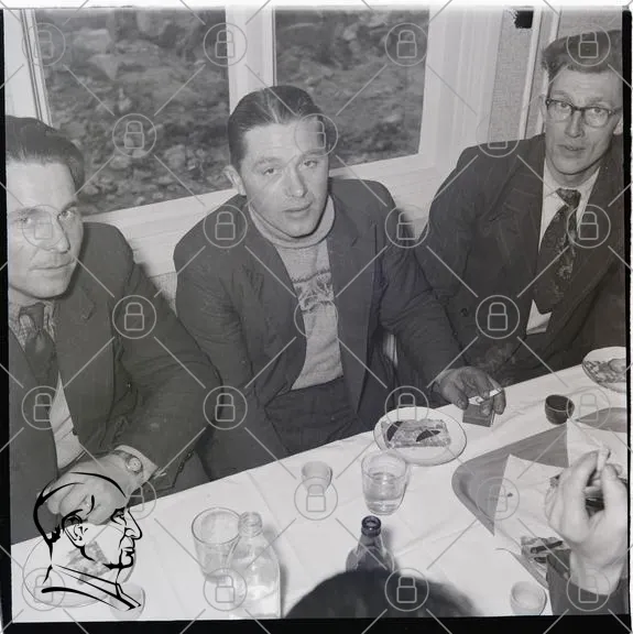 män, bord, middag, kläder, glas, mat, ägg, flaskor, fönster, svartvitt, 1940-tal, samtal, fest, sällskap, tallrikar, skålar, servetter, stolar, inomhus, socialt, tradition, gemenskap, leenden, uttryck, fotografi, nostalgi, historia, kultur, samling, vänner