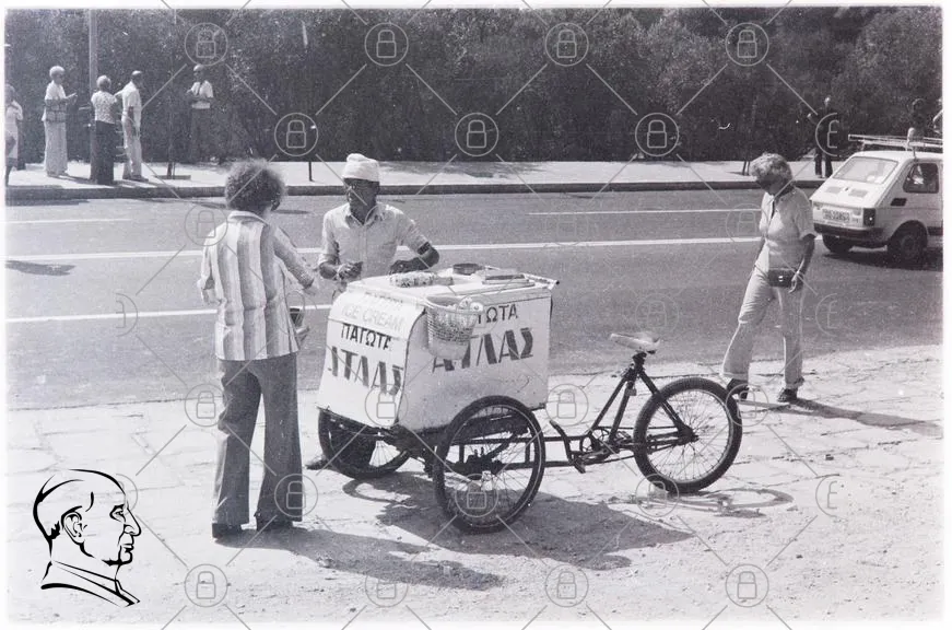 glassförsäljare, cykel, gata, människor, retro, svartvitt, 1970-tal, kiosk, sommar, stad, frysta, efterrätt, mat, utomhus, traditionell, handgjord, Atlas, grekisk, försäljning, nöje, familj